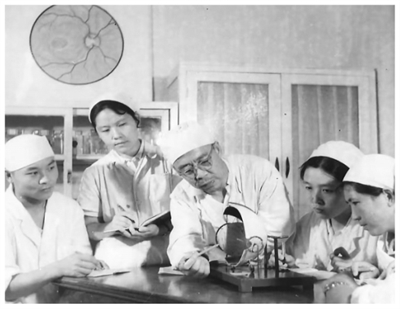 刘世钺(中)在白求恩国际和平医院眼科办公室为年轻医生开展临床教学。 |