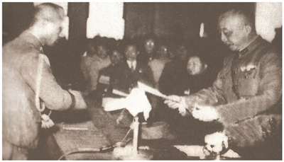 1945年10月25日,中国战区台湾省受降主官陈仪(右一)接受日本投降代表的投降书。 |