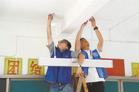 在福建长汀县,厦门党员志愿者为南山中学教室安装灯具。