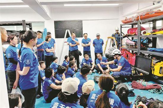 思明区蓝天救援队培训讲解索降装备使用方法。