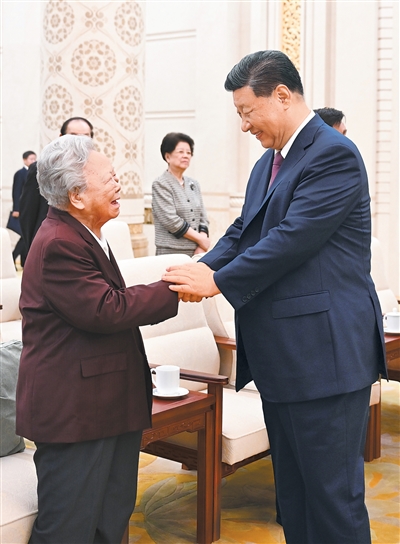 二〇二四年九月十四日,中共中央、全国人大常委会在北京人民大会堂隆重举行庆祝全国人民代表大会成立七十周年大会。这是会前,习近平同志与彭珮云同志握手。 |