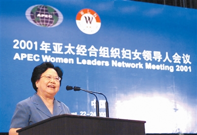2001年8月22日,2001年亚太经合组织妇女领导人会议在北京人民大会堂开幕。这是彭珮云同志在开幕式上发表讲话。 |