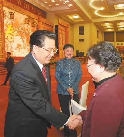 二〇〇八年二月五日,中共中央、国务院在北京人民大会堂举行二〇〇八年春节团拜会。这是胡锦涛同志与彭珮云同志握手。 |