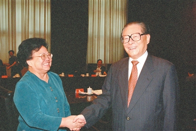 1998年9月10日,全国妇联新一届领导班子成员和中国妇女第八次全国代表大会部分代表在中南海座谈。这是江泽民同志与出席座谈会的彭珮云同志握手。 |