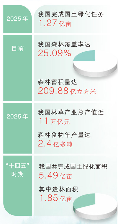 记者从全国林业和草原工作会议上获悉:2025年,我国完成国土绿化任务1.27亿亩,其中营造林5345万亩,退化草原修复治理7390万亩。目前全国森林覆盖率达25.09%,森林蓄积量达209.88亿立方米,绿色发展底色成色更加鲜明。