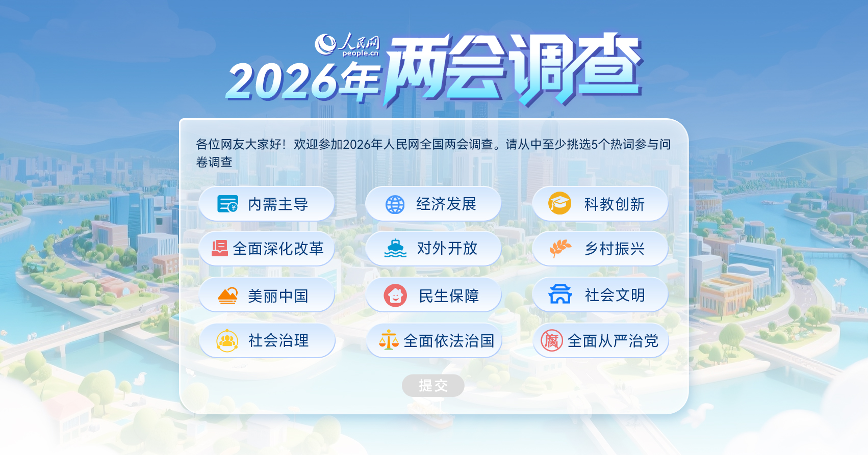 网友可通过人民网2026年全国两会调查专题、“人民网+”客户端、人民网法人微博、人民网官方微信、人民网“领导留言板”、“学习大国”微信公众号等全媒体通道进入调查页面,选择您最关心的热词并填写调查问卷。