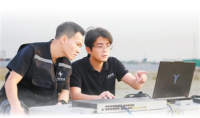 在地面站软件中调整技术参数,规划测试航线,进行完整飞前检查、确认空域,丁聪颖按下了起飞键。“嗡——”随着旋翼开始转动,无人机迅速离地爬升。“抵达预定高度,开始自动飞行和载荷功能测试。”丁聪颖的目光紧紧盯着屏幕,不断观察高度、姿态、电量、风速等数据。不远处,另一个团队成员手握遥控器,密切关注无人机的空中轨迹,以备应急接管。