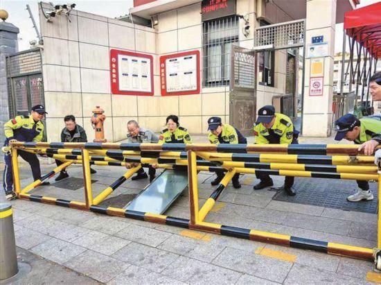 校门口道闸意外倾倒,队员们齐心协力将其扶起。