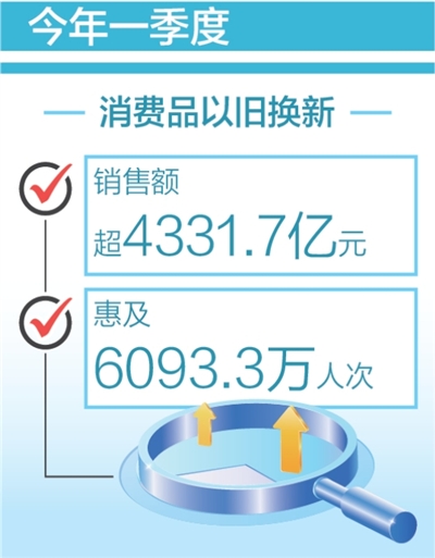 本报北京4月5日电 (记者王珂)记者从商务部获悉:今年一季度,消费品以旧换新销售额超4331.7亿元,惠及6093.3万人次。