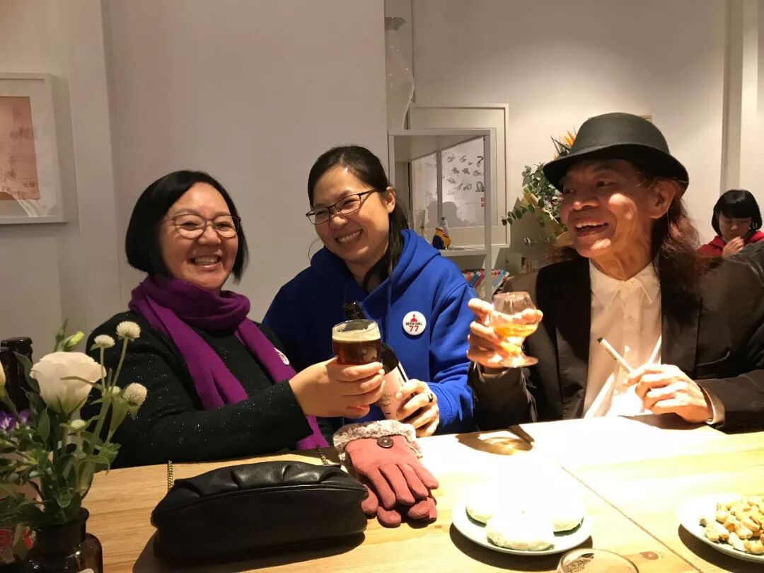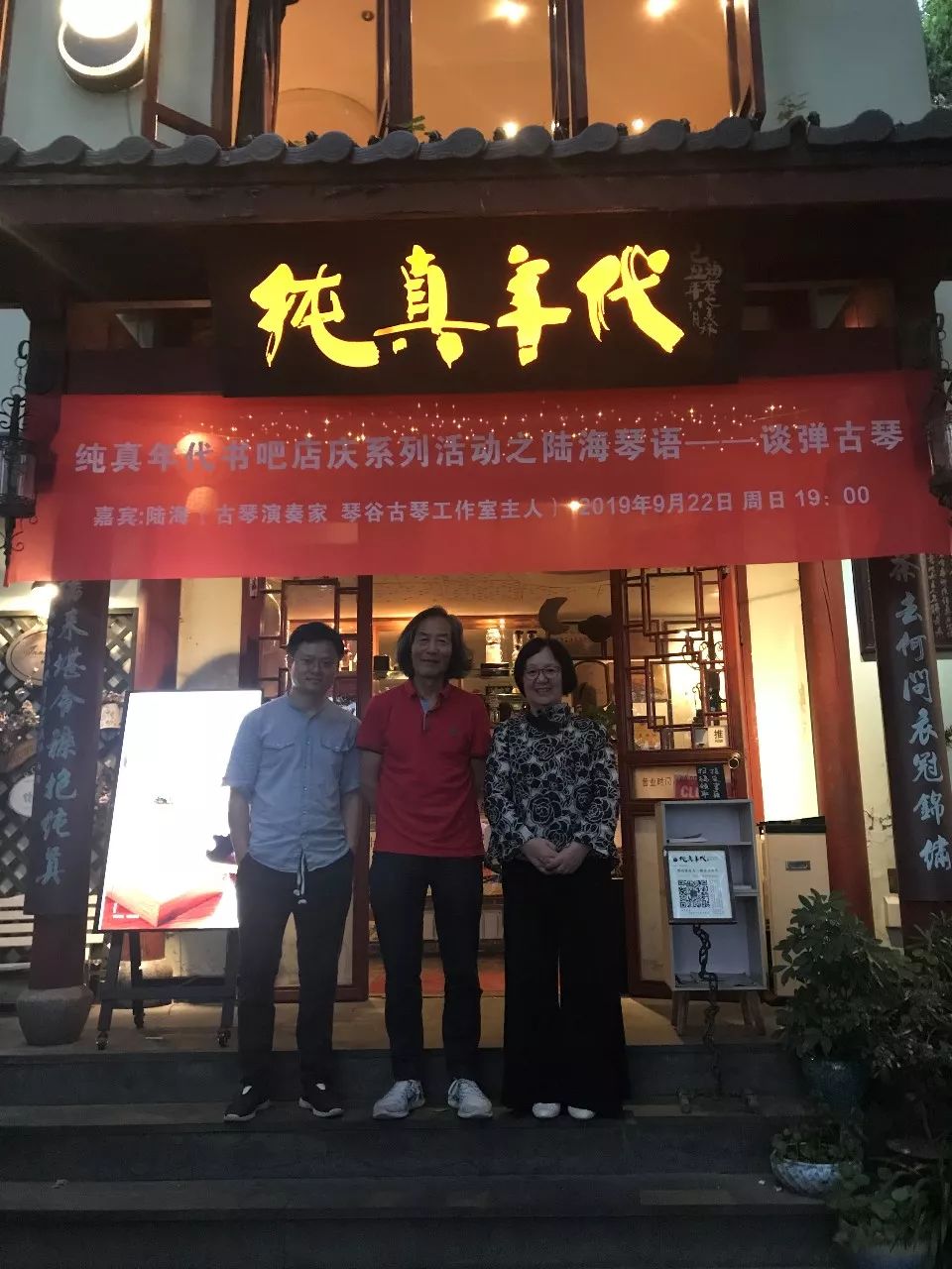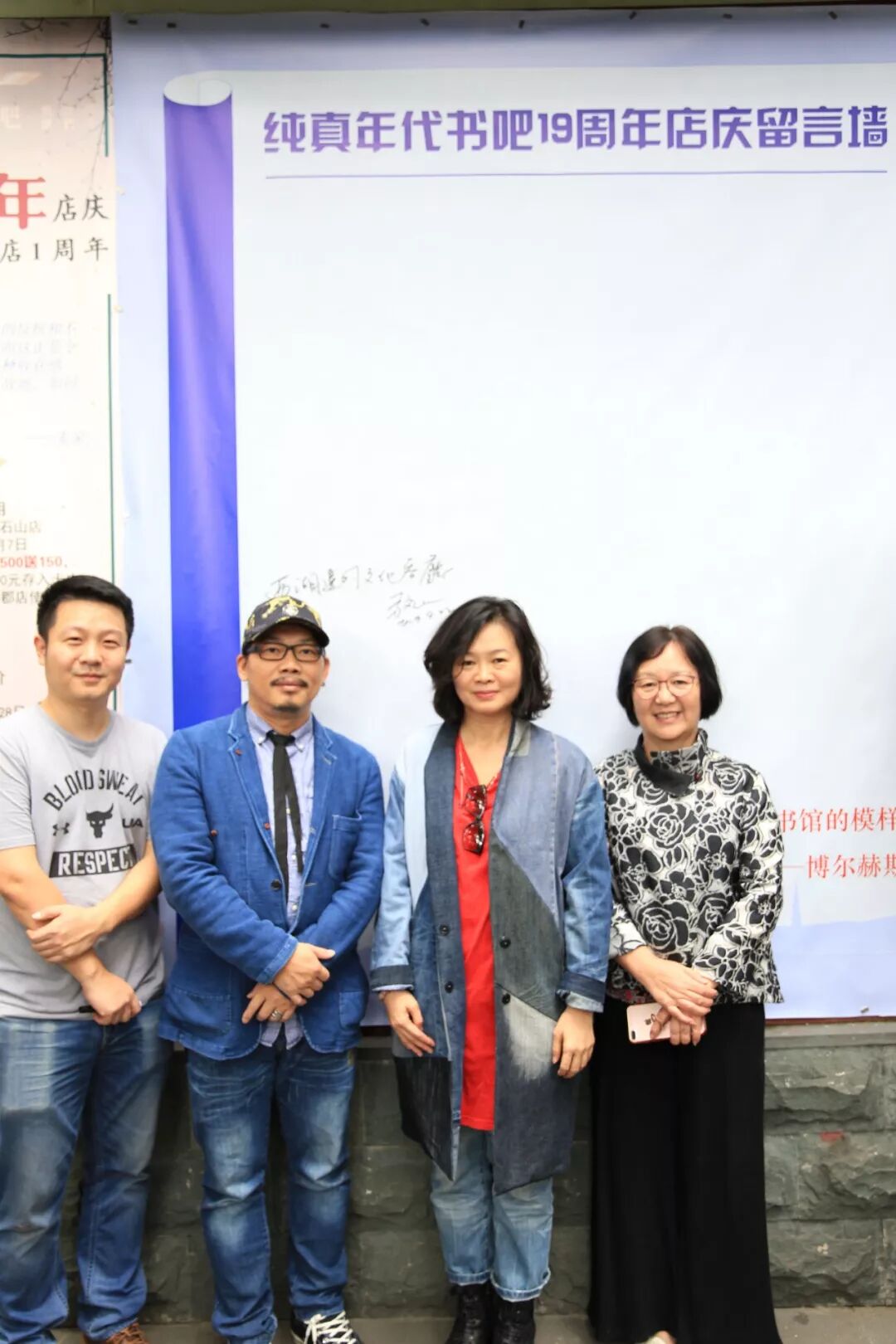 书吧少主人盛厦、方文山、颜艾琳、朱锦绣老师合影  傍晚边,诗人泉子陪着书法大家王冬龄老师来访 在夜色中为纯真年代题词:湖山一览 永葆纯真