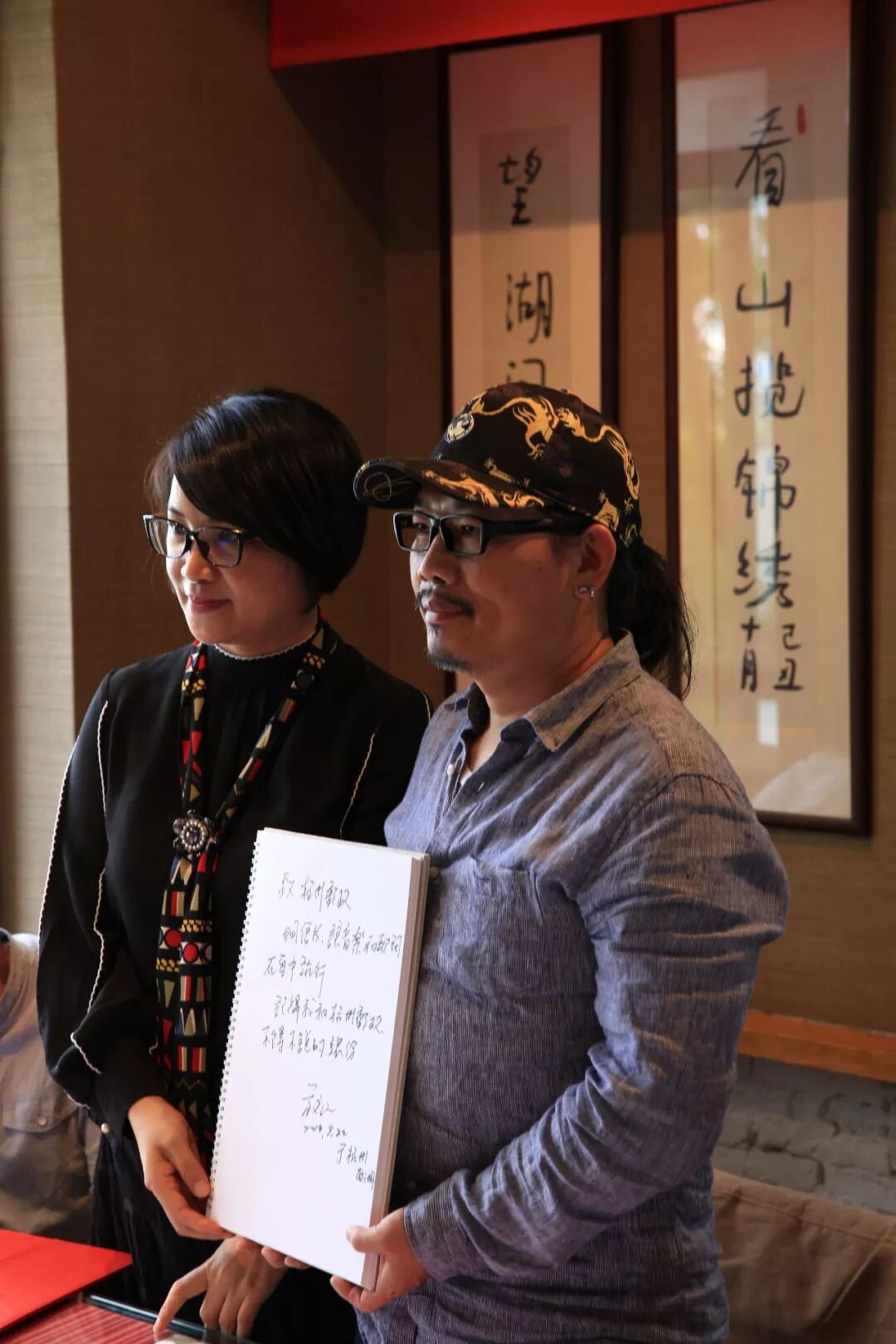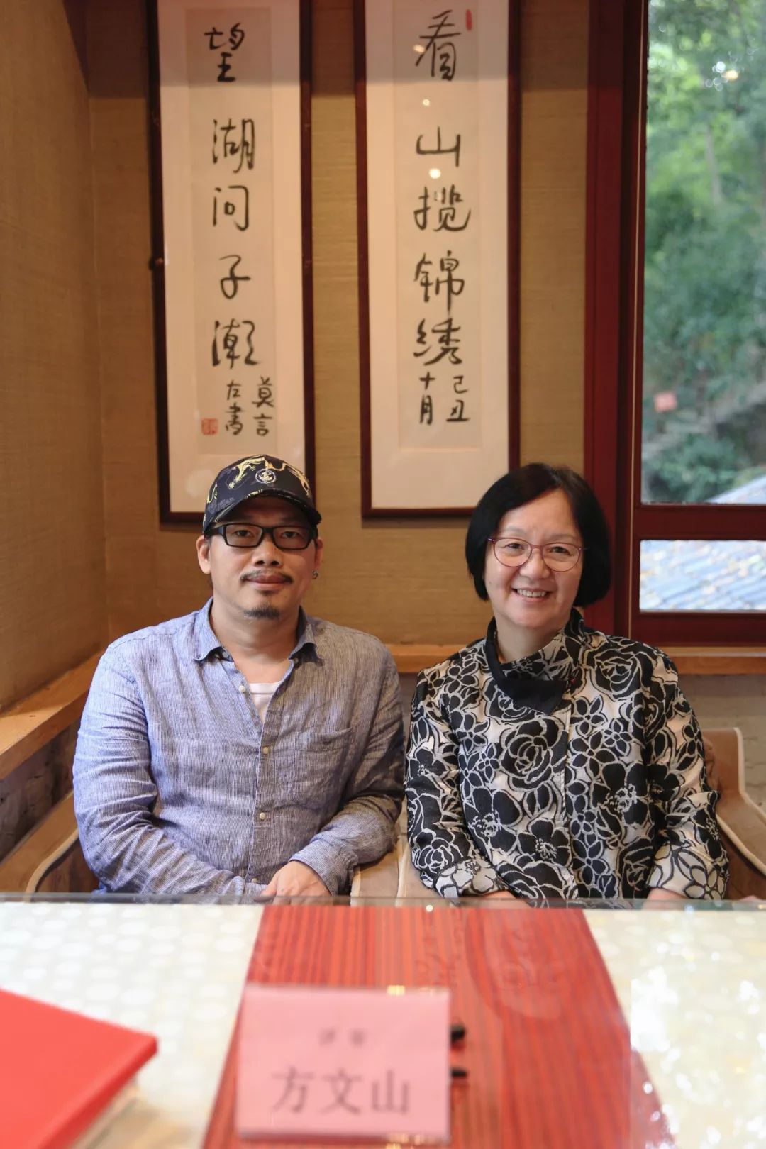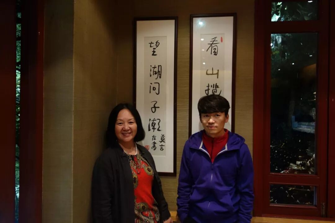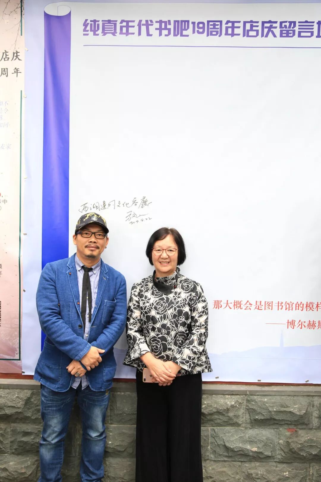 方文山与书吧女主人朱锦绣在莫言题词“看山揽锦绣,望湖问子潮”前合影