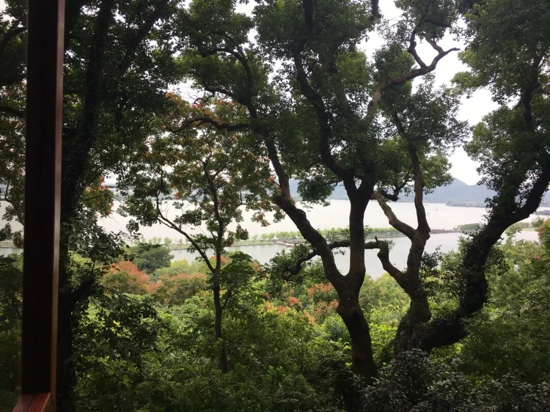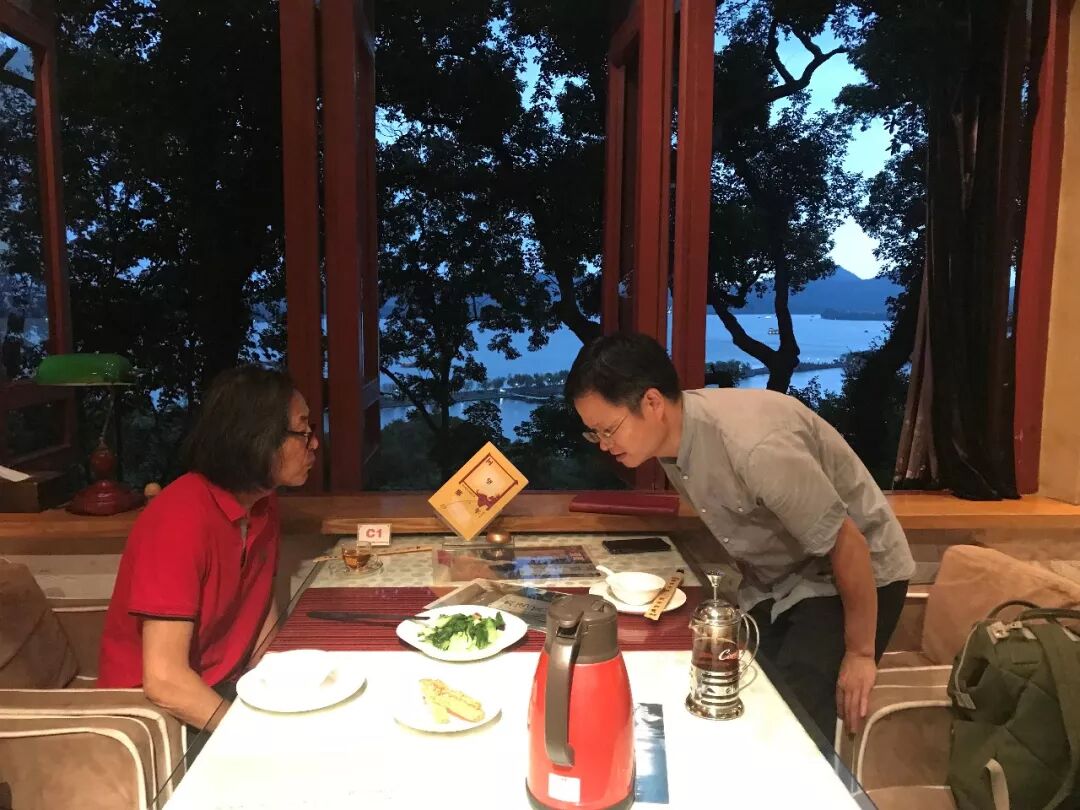 泉子和王冬龄老师正准备用餐,但是窗外的西湖真正秀色可餐