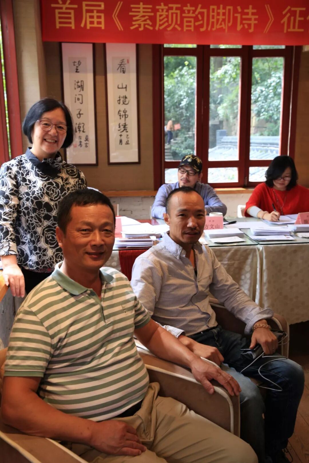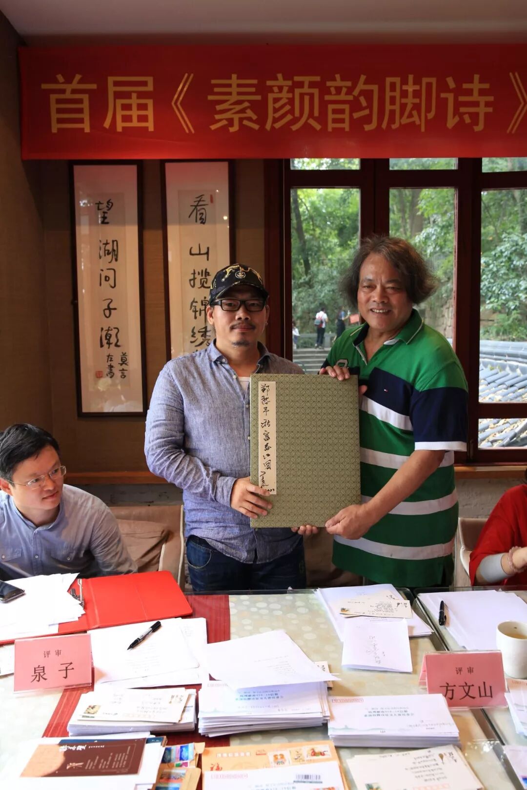 方文山全神贯注,无暇欣赏窗外的西湖 文山与诗人、杭州市作协副主席泉子、台湾两岸桂冠诗人颜艾琳认真评选 右一杭州市邮票局局长叶冬梅 她的微信这样写道:迈过236个台阶,又到了西湖北山街的“纯真年代书吧”,著名词人,诗人,艺术家,还有杭州作协领导等齐聚一堂,“首届素颜韵脚诗”评审已近尾声,获奖作品开始从堆积如山的明信片与信件中脱颖而出,不知道哪位幸运儿深情排列的文字能穿透评审老师的心?让人有那么美的想象……