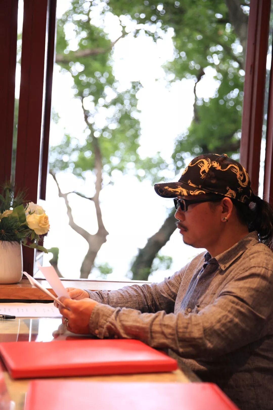 初秋的西湖水波荡漾,层林尽染,阳光穿透树林洒落下来。上午11点半刚过,一个熟悉的身影出现在山路上。 “方文山要来了?” “哪个方文山?” “就是给周杰伦合作写歌的那个啊” 在宝石山腰纯真年代书吧面对西湖的大露台上喝茶的客人和过往的游客听闻,激动得纷纷张望,拿手机拍照。 只见标志性的鸭舌帽、一身牛仔衣的方文山正和一行人一起快步上山,来到了书吧门前。