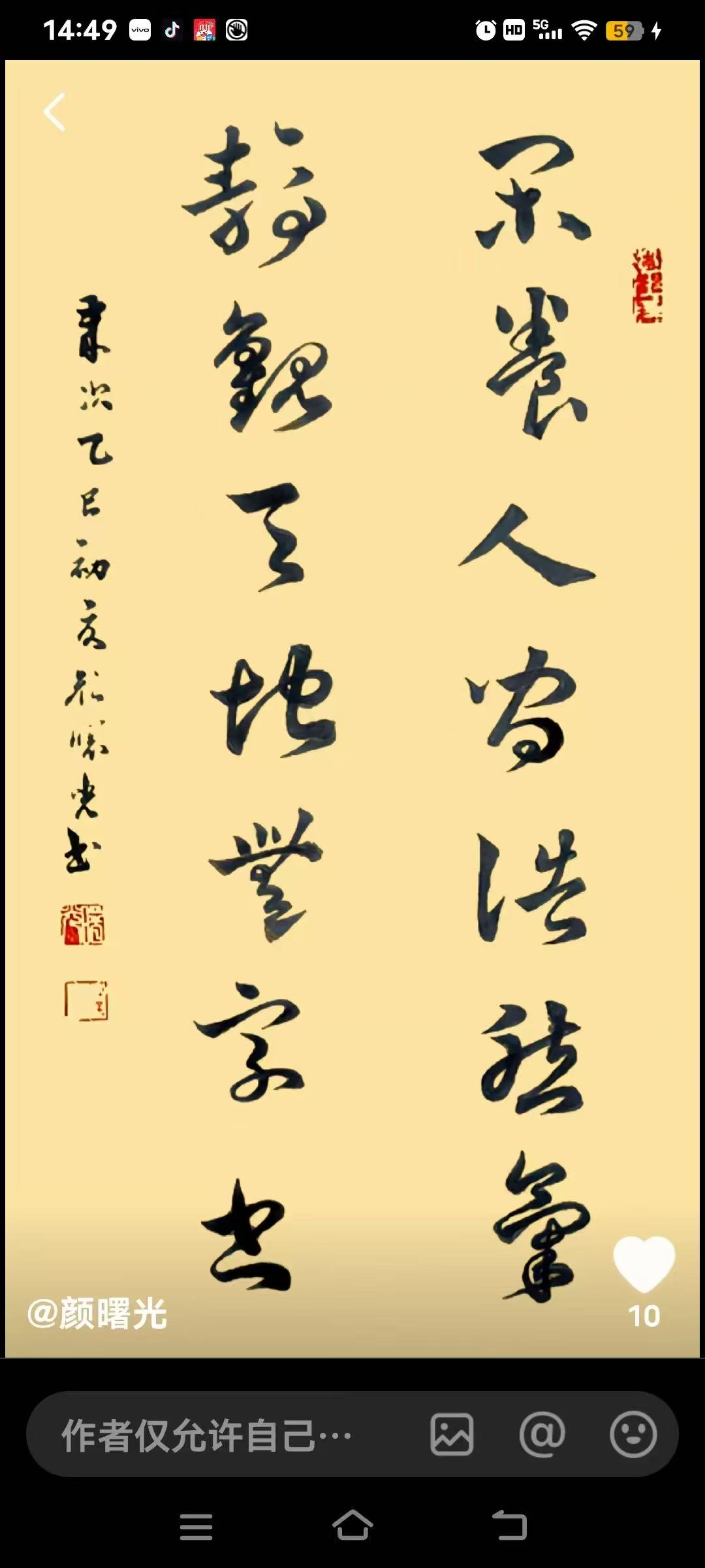 (颜建波讯)把生活中的格言与典句体现在现实,也是一种创作。让人们体会书法与生活息息相关,是一种独到见解,颜曙光具备了这个天赋。以下就是他的佳作: