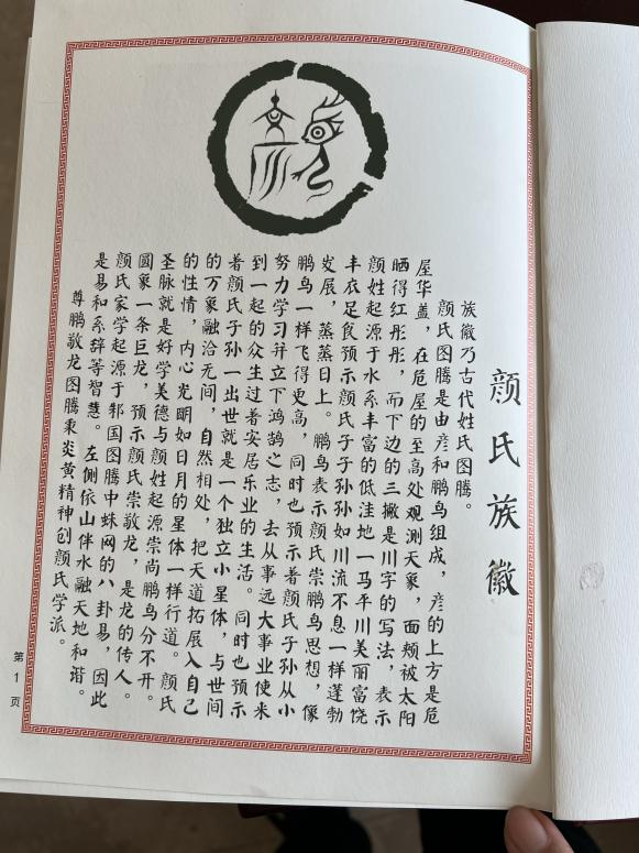 颜氏家族的昌荣兴旺,既有里居得天独厚的地理环境为基,更有颜家绵绵家风为根。颜氏族徽便将其家族的德贤风范展现无遗——志在鲲鹏,川流不息。细看其族徽,左边的彦字上有危屋华盖,寓意家族蒸蒸日上,下有富饶河流,寓意子孙川流不息,而右边是则是一只鹏鸟,表示颜氏崇尚鹏鸟思想,教育后代子孙需从小勤学苦练,立下鸿鹄之志,在未来从事伟大事业,续写家族辉煌。颜氏优良的家风传统,教育着世代子孙好学美德,不断为家族伟业的成就输送贤才,可谓是各宗各族的优秀典范之一。