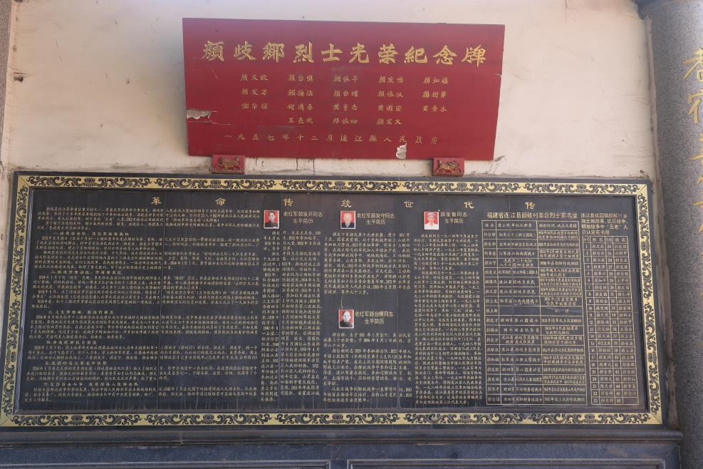 对于颜岐颜氏而言,绵延百年的优良家风是不能丢的根、不能忘的本,它如一首传唱不衰的歌谣,回荡在颜岐这片秀美的土地上,哼进每个颜氏子孙的心中,志在鲲鹏是它谱写出的乐章,而爱国精神,则是它最优美的主旋律。颜氏宗祠“钟楼”上的《颜岐乡烈士光荣纪念牌》记载:“颜岐是连江革命老区重点村之一,有着光荣的革命斗争历史。”从土地革命、抗日战争到解放战争,颜岐颜氏涌现出许多可歌可泣的人物——组建游击队,投身于土地革命的颜发开;挺进罗源山,开辟新苏区的颜发德;攻克罗源城,救治伤病的颜丹仙;奔赴皖南城,坚守抗日前线的颜台顺......1957年,全村有23人被连江县政府追认为革命烈士,有9位老红军,四十多位“五老”人员,2012年,连江县政府授予颜岐村为“颜岐革命老区村”。颜氏族人怀着沉甸甸的爱国之心,国难当头最先响应,他们坚持十多年艰苦卓绝的地下斗争和游击战争,留下了波澜壮阔的红色诗篇。