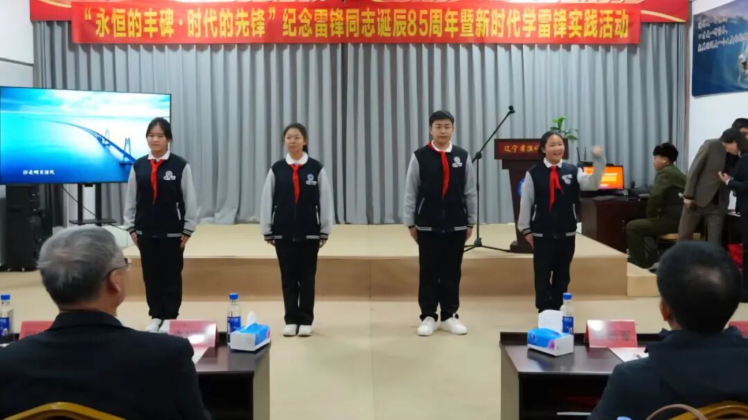 首先,由营口市第十七中学少先队员向雷锋叔叔献词。纯真而坚定的誓言里,蕴藏着雷锋精神代代相传的希望。来自沈阳化工大学雷锋班的曾嘉瑜、陈怡诺、郭炳童、张敬蕊4名同学带来演讲《致敬雷锋——青春挺膺担复兴》,以青春之名,诠释当代青年学子的担当。4名少先队员为4名雷锋班学长佩戴红领巾。