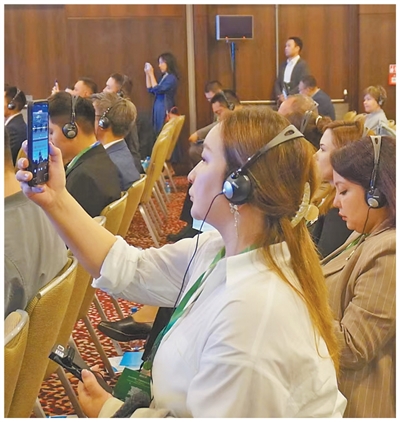 参加2025中国—中亚媒体合作论坛报道的中亚国家媒体记者正在拍摄视频。 |