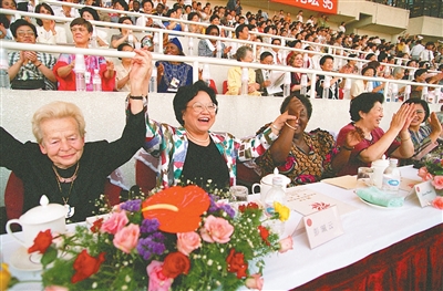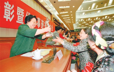 2001年5月12日,“中国十大杰出母亲”表彰暨事迹报告会在北京举行。这是彭珮云同志为获得首届“中国十大杰出母亲”荣誉称号的母亲颁奖。 |
