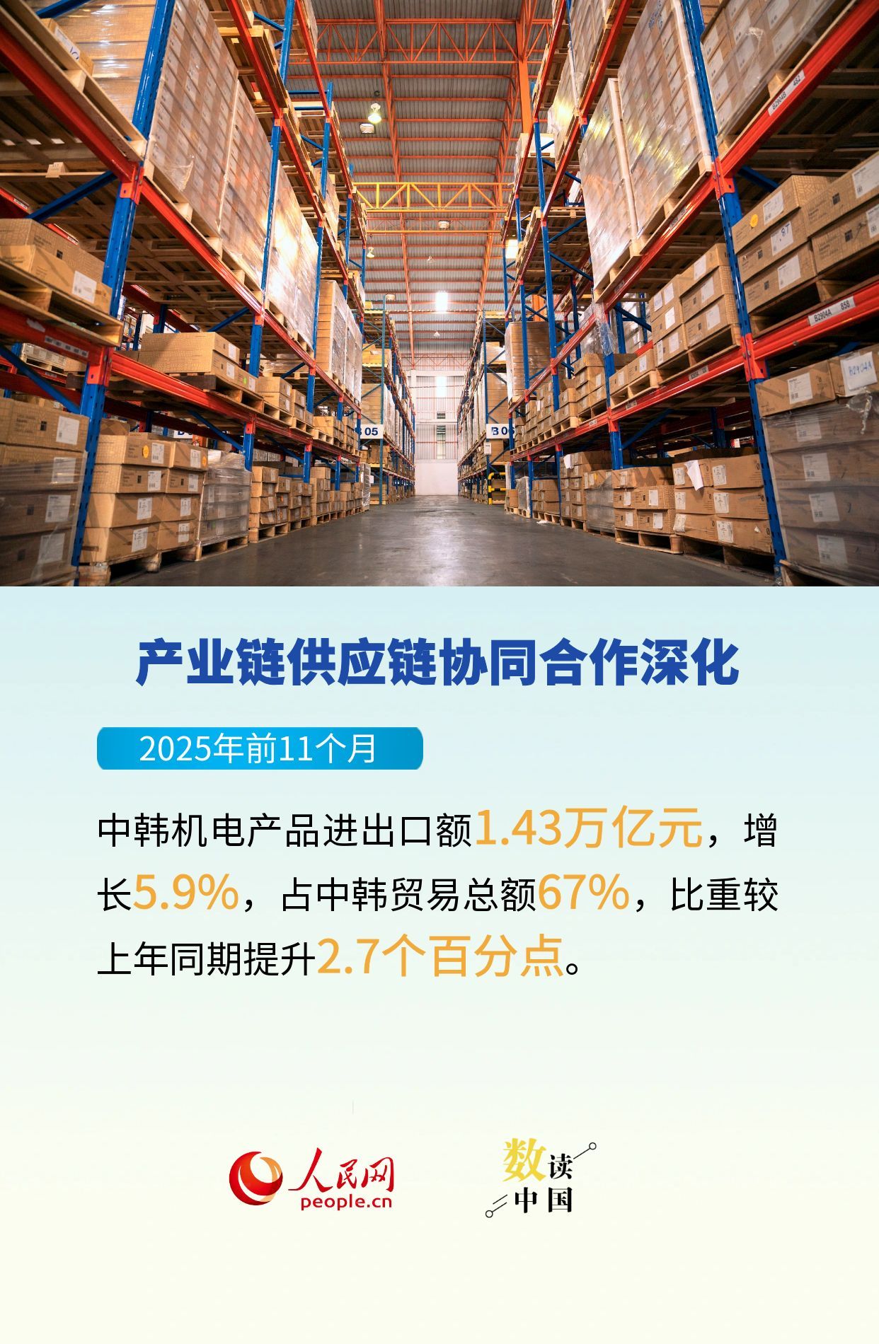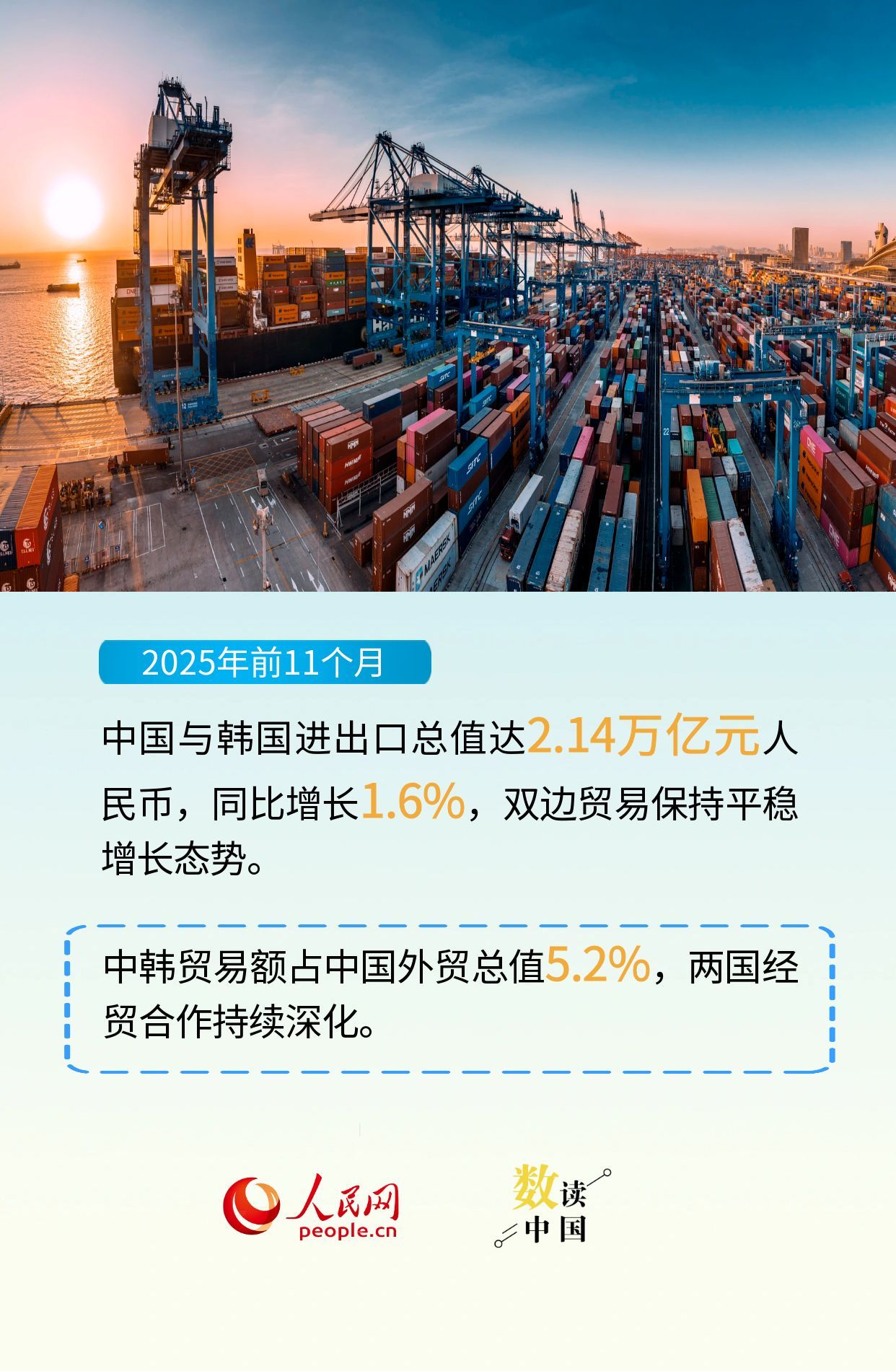 中韩是重要近邻和经贸合作伙伴,在全球经济不确定性日益加剧的背景下,中韩经贸合作韧性持续显现,为两国关系发展注入新动力,也为地区和平与繁荣增添新活力。