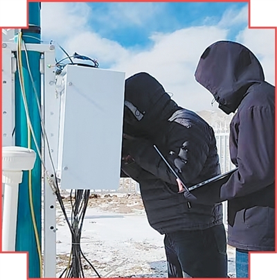 张晓星(右)和同事在维修气象设备。 |