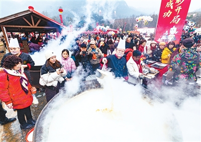 丰都庙会现场,游客品尝美食。 |