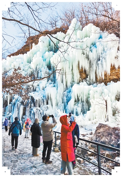 北京市平谷区鱼子山村的冰瀑吸引游客打卡。 |