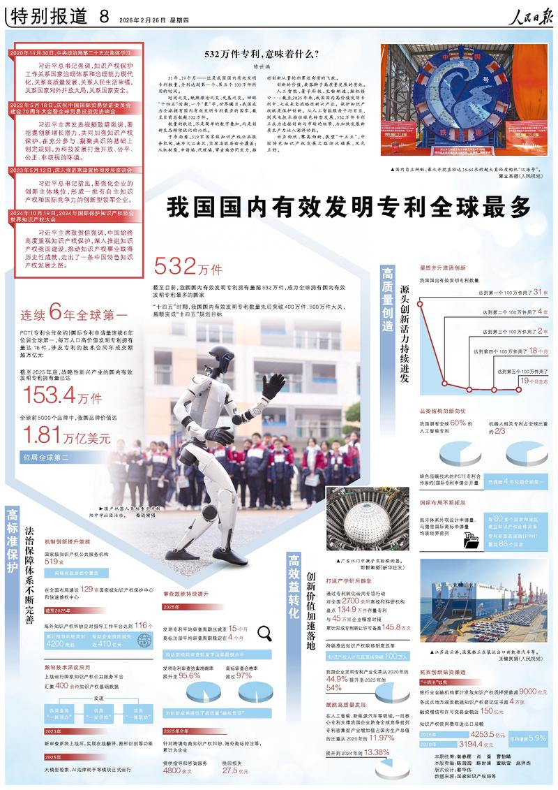 本报北京2月25日电 (记者谷业凯)国家知识产权局数据显示:我国国内有效发明专利达532万件,成为世界上首个国内有效发明专利数量突破500万件的国家。“十四五”时期,我国国内有效发明专利数量持续增长,每万人口高价值发明专利拥有量达16件。截至2025年,我国发明专利申请量已连续多年位居全球第一,成为名副其实的专利大国。