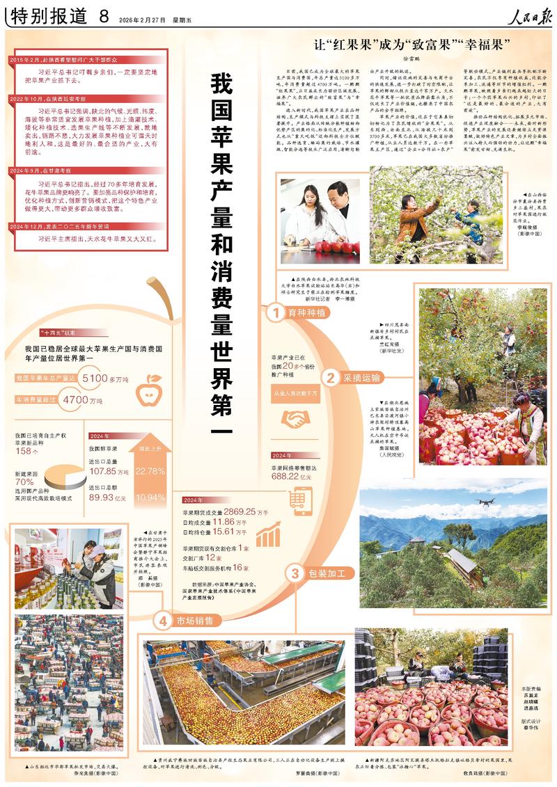 本报北京2月26日电 (记者常钦、李晓晴)中国人的“果盘子”里,苹果占据着举足轻重的地位。中国苹果产业协会联合国家苹果产业技术体系发布的《中国苹果产业发展报告》显示,“十四五”以来,我国已稳居全球最大苹果生产国与消费国。苹果期货成为全球首个鲜果期货品种,我国在国际定价体系中的话语权显著提升。这颗“国民果”迈入高质量发展的新阶段。