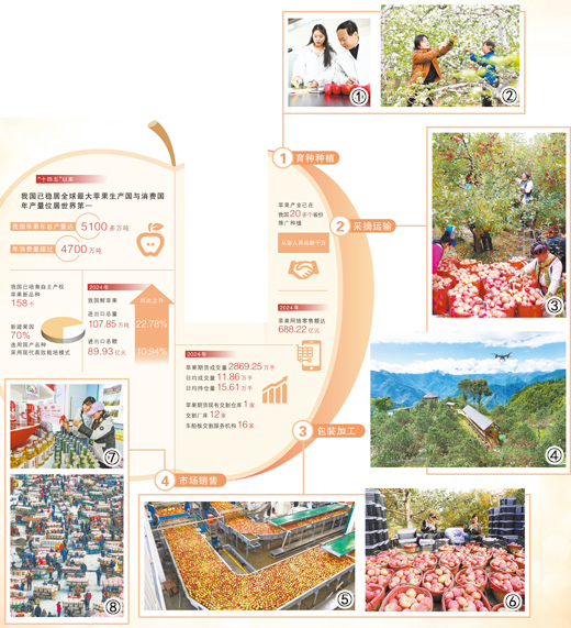 报告显示,我国苹果年总产量达5100多万吨,年消费量超过4700万吨。庞大数字的背后,是种业“中国芯”的强势崛起。目前我国已培育自主产权苹果新品种158个,新建果园70%选用国产品种,采用现代高效栽培模式。