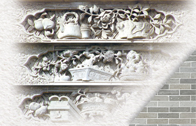 广东中山古典园林詹园里的照壁,上有精美的砖雕。 |